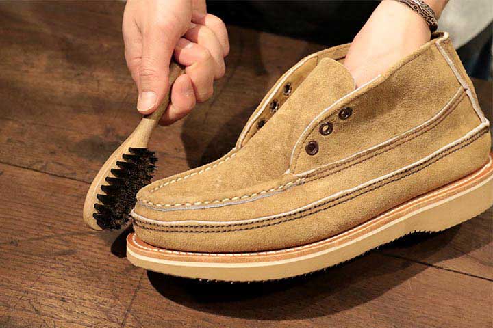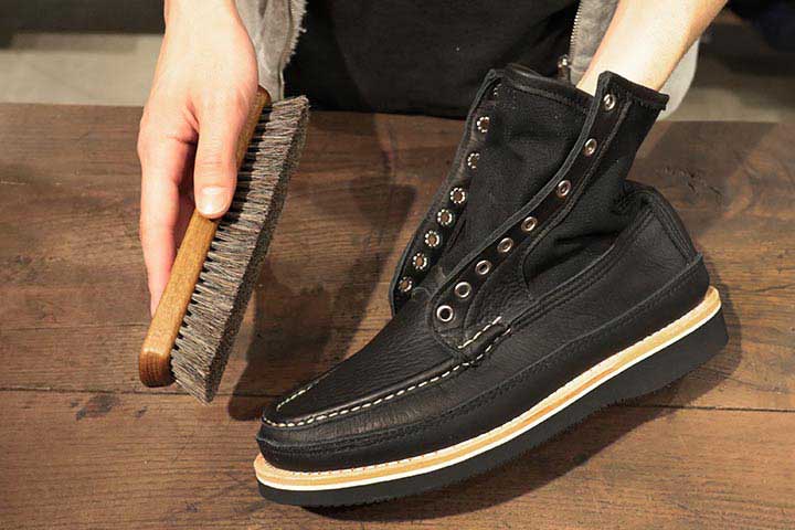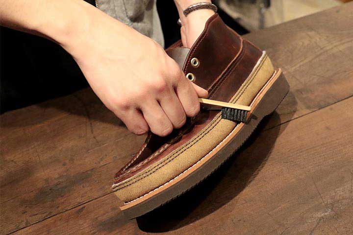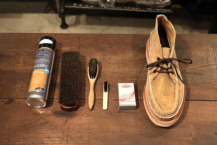 履きこんだスウェードレザーで良く見られる「毛の潰れ」や「テカリ」には、スウェード用ブラシがオススメです。