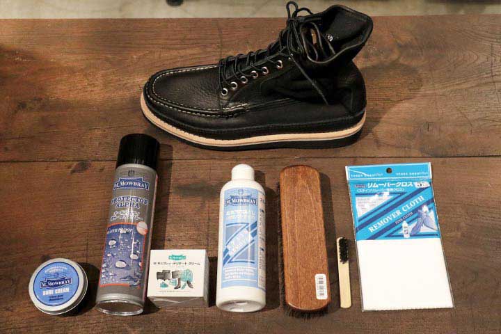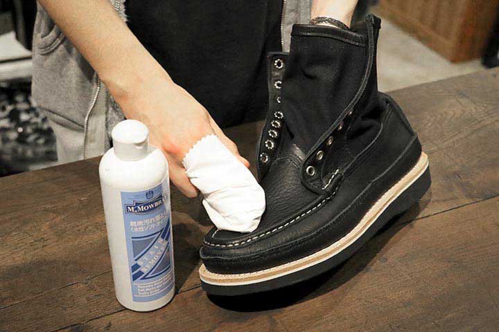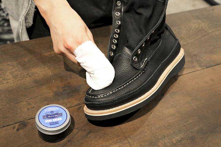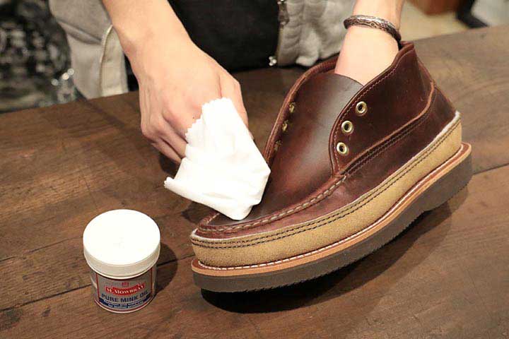 クリームブラシかクロスに、オイルレザー用のミンクオイルを少量取り、ブーツ全体に薄く伸ばしながら保湿・栄養補給をします。