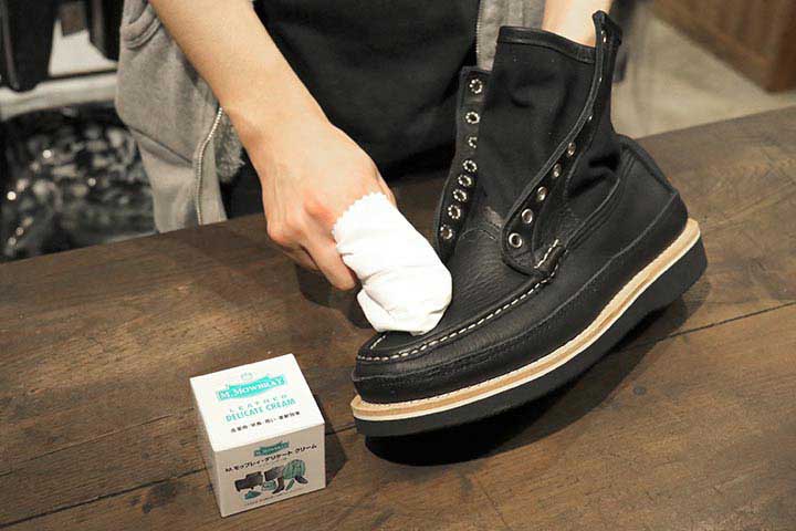 クリームブラシかクロスに、デリケートクリームを少量取り、ブーツ全体に薄く伸ばしながら保湿・栄養補給をします。
